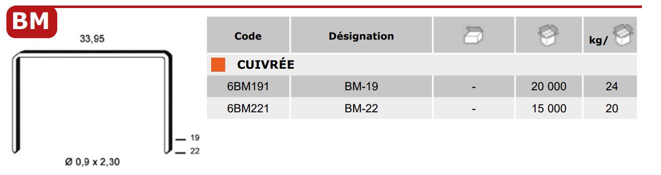 En résumé, les agrafes BM cuivrées 19 et 22 mm représentent une solution de fixation efficace, durable et résistante, idéale pour toutes les opérations nécessitant solidité, sécurité et protection des emballages dans les secteurs de la logistique, du conditionnement et de l’industrie.