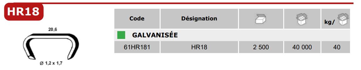 Grâce à leur conception robuste et à leur fil épais, les agrafes HR18 assurent une excellente résistance mécanique, idéale pour les assemblages soumis à de fortes contraintes. Leur largeur de 20,6 mm permet une répartition homogène de la pression, évitant l’endommagement des matériaux fixés. Le traitement galvanisé offre une protection efficace contre la corrosion, garantissant ainsi la durabilité des fixations en extérieur et dans des environnements humides.