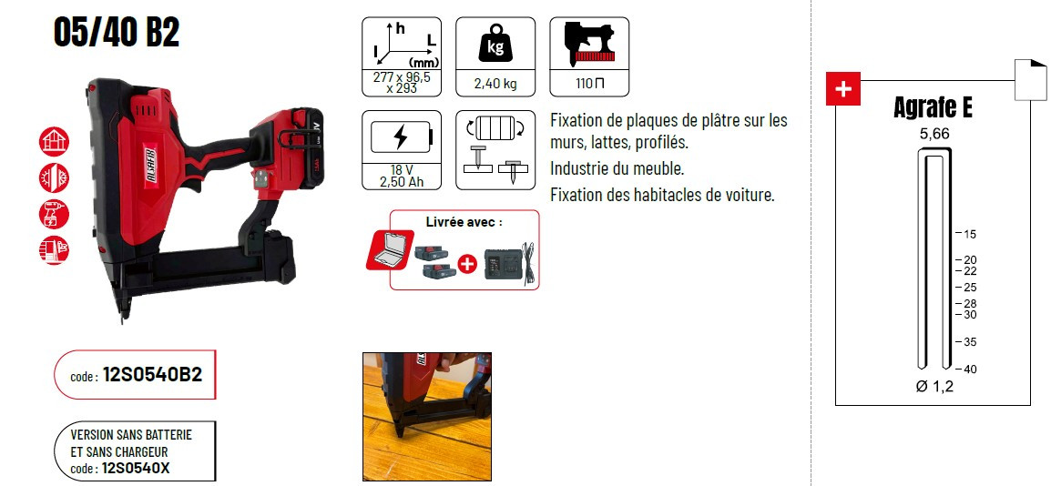 La 05/40 B2 est une agrafeuse sans fil compacte et puissante, spécialement conçue pour la fixation rapide et précise d’agrafes type E dans les travaux d’aménagement intérieur et de finition. Elle fonctionne sur une batterie 18 V de 2,50 Ah, offrant une bonne autonomie tout en conservant un outil léger et maniable, idéal pour une utilisation prolongée sur chantier ou en atelier.