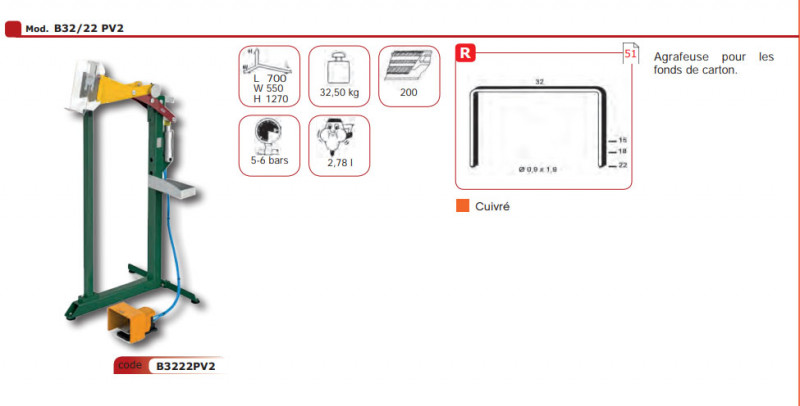 Agrafeuse carton sur pied B32/22 PV2 pour agrafes R de 15 à 22mm -  Fiche technique