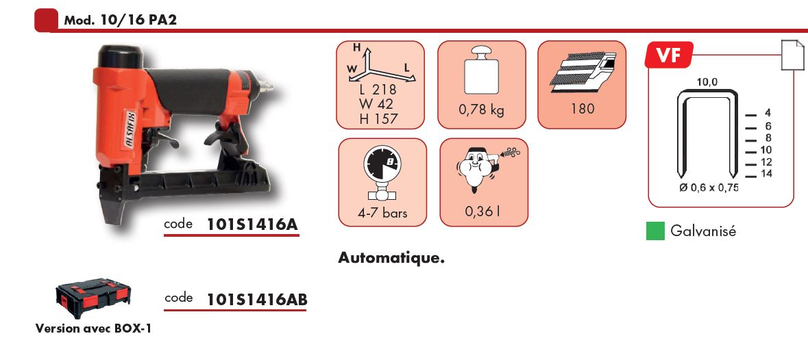 Agrafeuse pneumatique ALSAFIX 10/16 PA2 pour agrafes VF de 4 à 14mm