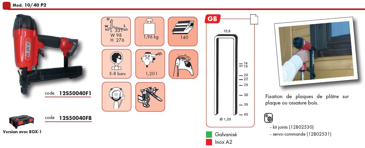 Agrafeuse pneumatique ALSAFIX 10/40 P2 pour agrafes GB de 14 à 40mm -  Fiche technique
