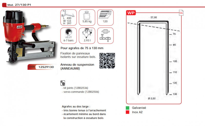 Agrafeuse pneumatique ALSAFIX 27/130 P1 pour agrafes WP de 75 à 130mm