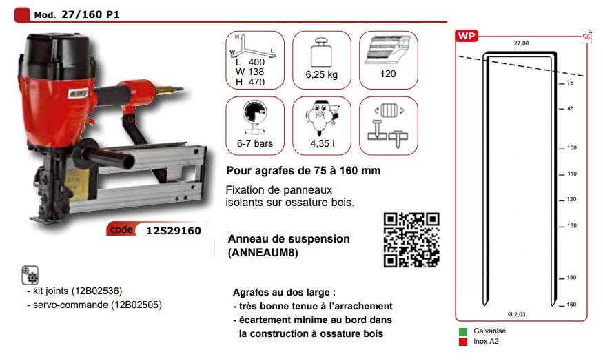Agrafeuse pneumatique ALSAFIX 27/160 P1 pour agrafes WP de 75 à 160mm