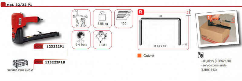 Agrafeuse pneumatique carton ALSAFIX 32/22 P1 pour agrafes R de 22mm -  Fiche technique