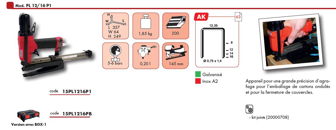 Agrafeuse pneumatique carton ALSAFIX PL 12/16 P1 pour agrafes AK de 8 à 16mm -  Fiche technique