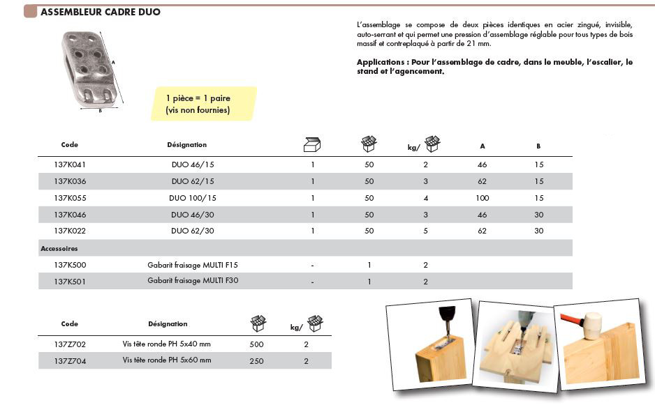 L’assemblage se compose de deux pièces identiques en acier zingué, invisible, auto-serrant, il permet le réglage de la pression d’assemblage grâce aux vis d’accroche pour tous types de bois massif et contreplaqué à partir de 21 mm.