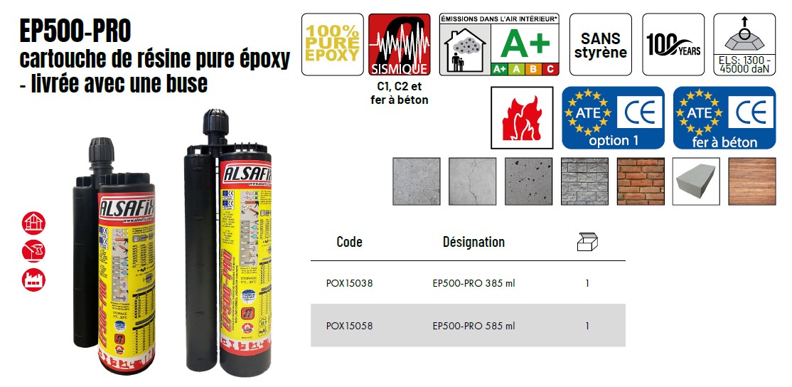 La cartouche Alsafix EP500-PRO se distingue par sa formulation en résine époxy pure offrant une résistance mécanique maximale pour les fixations les plus exigeantes. Elle garantit une excellente tenue dans le temps, même en conditions extrêmes ou en milieu humide, y compris dans les trous inondés. Sa certification pour béton fissuré et non fissuré ainsi que pour les zones sismiques assure une sécurité optimale sur les chantiers techniques. Sans styrène, elle convient parfaitement à une utilisation en intérieur, tout en restant compatible avec les tiges filetées et fers à béton standards. Sa polyvalence et sa fiabilité en font une solution idéale pour les applications structurelles à forte contrainte.