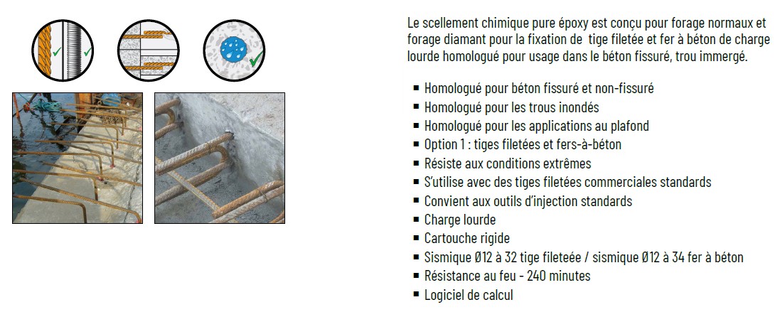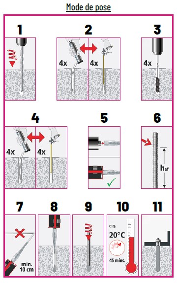 - Utilisation : scellement chimique pour tiges filetées et fers à béton