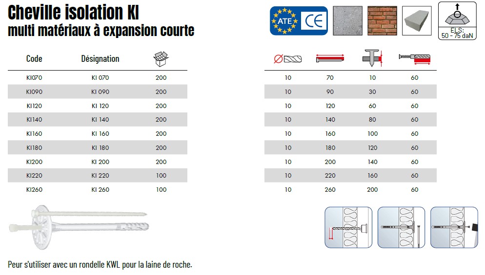 Application : Peut s’utiliser avec une rondelle KWL pour la laine de roche.