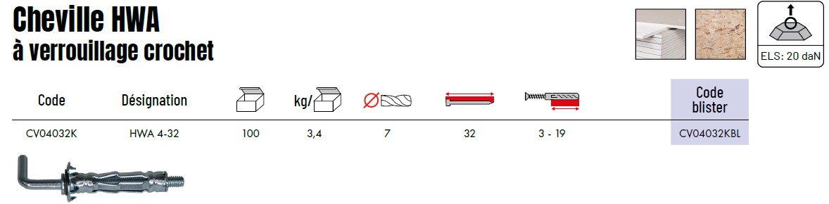 Accueil >> Chevillage, Scellement Chimique, Colle >> Chevilles matériaux creux >> Chevilles HWA à crochet