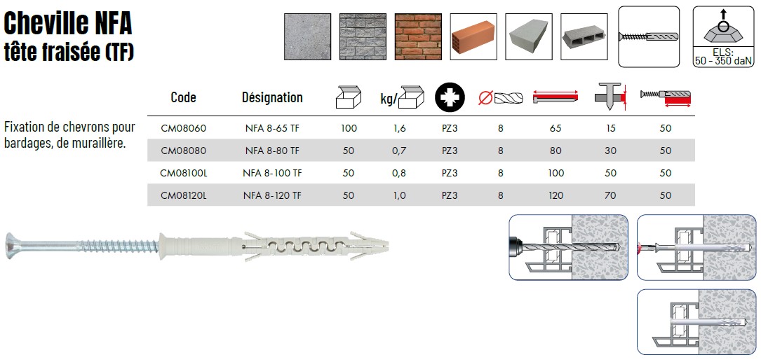 Matériaux supports : Béton non-fissuré, hourdis, pierre naturelle, brique pleine et creuse, silico-calcaire solide et creuse, béton léger et cellulaire.