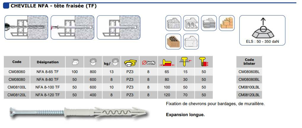 Accueil >> Chevillage, Scellement Chimique, Colle >> Chevilles Nylon à Visser à Expansion NFA >> Chevilles NFA - tête fraisée (TF)