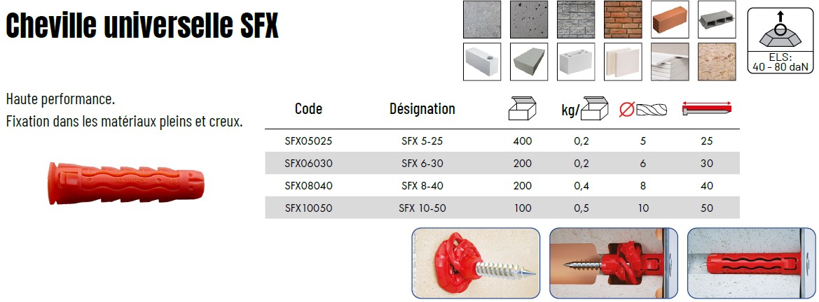 Chevilles nylon universelles SFX polyvalentes de haute performance.