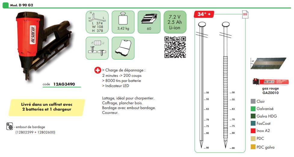 Cloueur à gaz Bois ALSAFIX D 90 G2 pour pointes 34°+ de 50 à 90mm