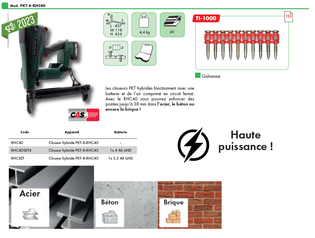 Cloueur hybride PKT-8-RHC40 pour pointes TI-1000 de 17 à 38mm - Fiche technique