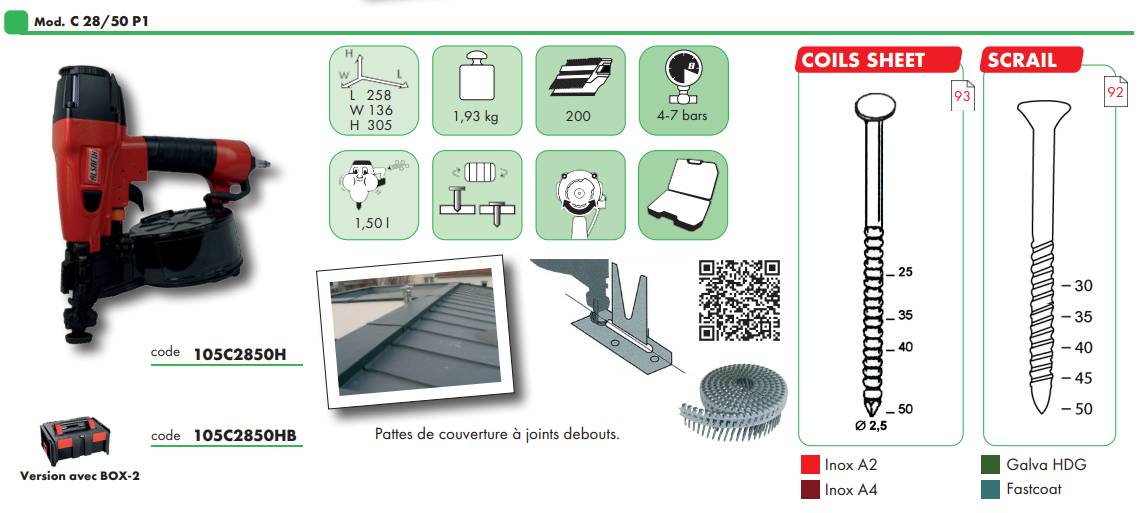 Cloueur pneumatique ALSAFIX C 28/50 P1 pour COILS SHEET et SCRAIL de 25 à 50mm -  Fiche technique