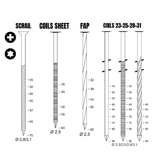 CLOUEUR C 28/70 P1 Coils 23-25-28 de 45 à 70 mm Coils sheet de 35 à 64 mm Fausse-vis de 35 à 65 mm L 268 - l 128 - H 306 - Poids : 2,05 kg.