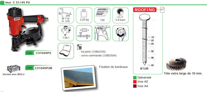Pour la finition de bardeaux. Alsafix ® - C-31-45-P2 ; BEA ® - 554-DC ; Bostitch ® - RN46 ; Senco ®...