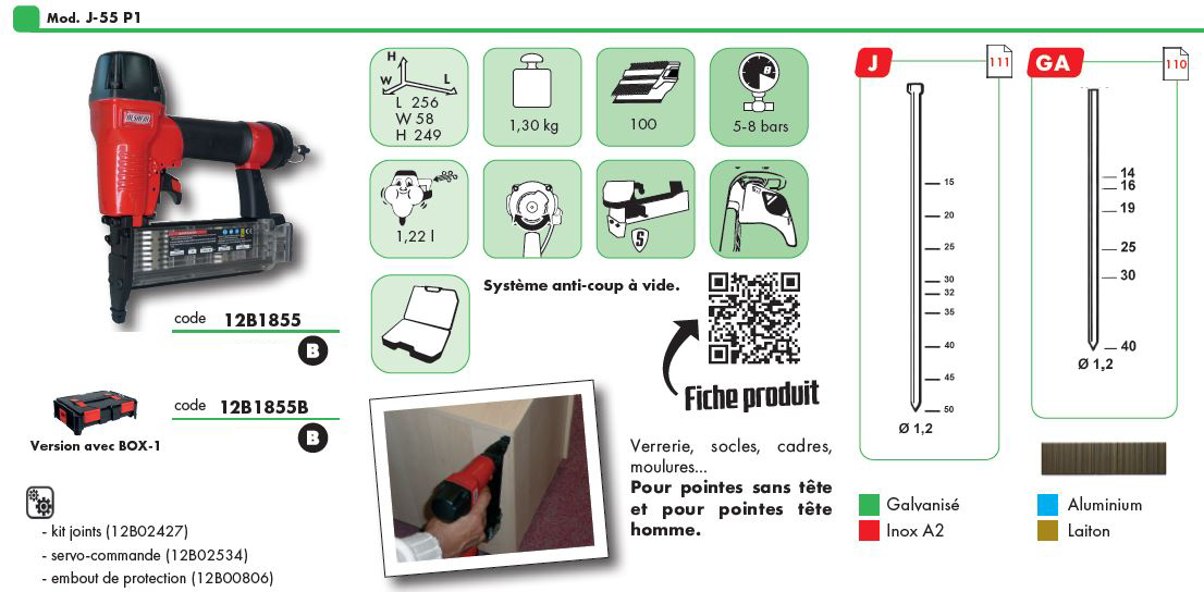Cloueur pneumatique J-55 P1 pour pointes GA (sans tête) de 14 à 40 mm et minibrads J (tête homme) de 15 à 50 mm. Il peut être commandé seul ou en box avec une burette d'huile et des clés 6 pans.