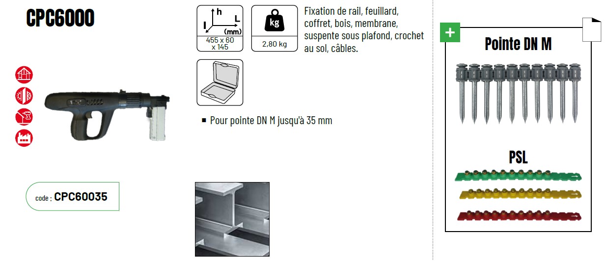 Le CPC6000 est un cloueur autonome à charges PSL, conçu pour la fixation rapide de rails, feuillards, coffrets, bois, membranes, suspentes sous plafond, crochets au sol et câbles. Compact et robuste, il accepte les pointes DN M jusqu’à 35 mm, ce qui en fait un outil polyvalent pour les travaux de second œuvre sur divers supports.