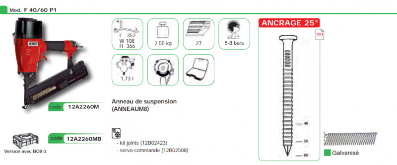Cloueur sabot pneumatique ALSAFIX F 40/60 P1 pour pointes ANCRAGE 25° de 40 à 60mm