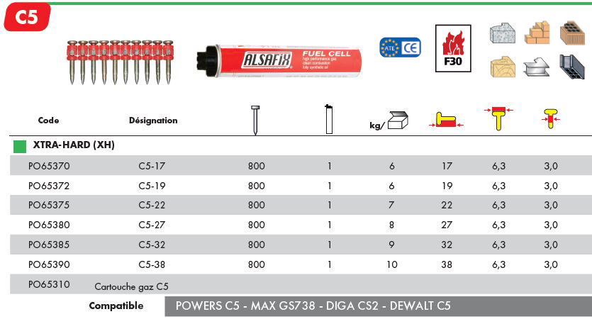 Clous C5 pour cloueur - Avec gaz - Fiche technique