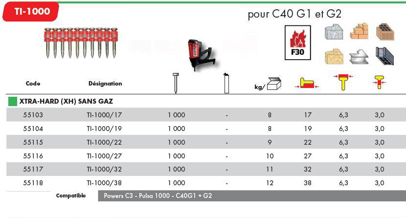 Clous TI-1000 pour cloueurs - Béton et acier - Sans gaz - Fiche technique