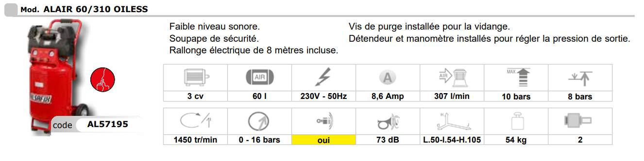 Avis sur "Compresseur électrique monophasé ALAIR 60/310 OILESS"