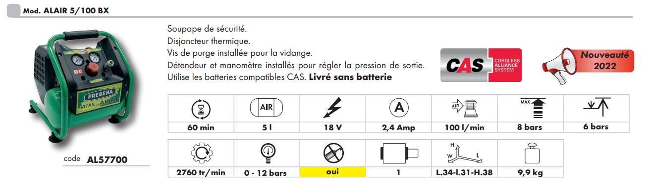 Avis sur "Compresseur sur batterie ALAIR 5/100 BX"