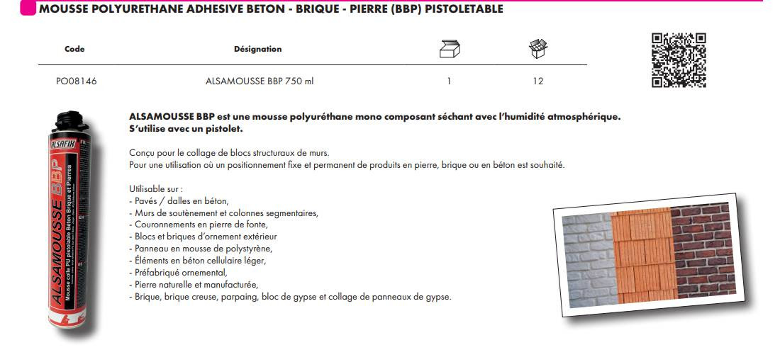 ALSAMOUSSE BBP est une mousse polyuréthane mono composant séchant avec l’humidité atmosphérique. S’utilise avec un pistolet