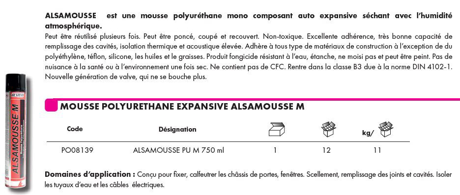 ALSAMOUSSE est une mousse polyuréthane mono composant auto expansive séchant avec l’humidité atmosphérique. Peut être réutilisé plusieurs fois, poncé, coupé et recouvert. Non-toxique. Excellente adhérence, très bonne capacité de remplissage des cavités, isolation thermique et acoustique élevée. Adhère à tous type de matériaux de construction à l’exception de du polyéthylène, téflon, silicone, les huiles et le graisses. Produit fongicide résistant à l’eau, étanche, ne moisi pas et peut être peint. Pas de nuisance à la santé ou à l’environnement une fois sec. Ne contient pas de CFC. Rentre dans la classe B3 due à la norme DIN 4102-1. Nouvelle génération de valve, qui ne se bouche plus.