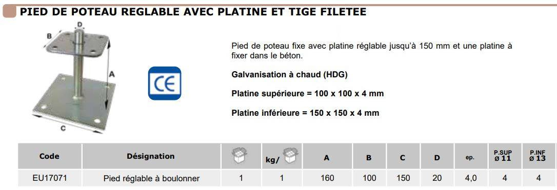 Pied de poteau réglable avec platine et tige filetée