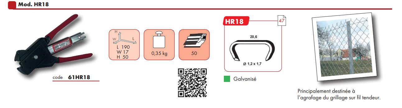 Application : Principalement destinée à l'agrafage du grillage sur fil tendeur.