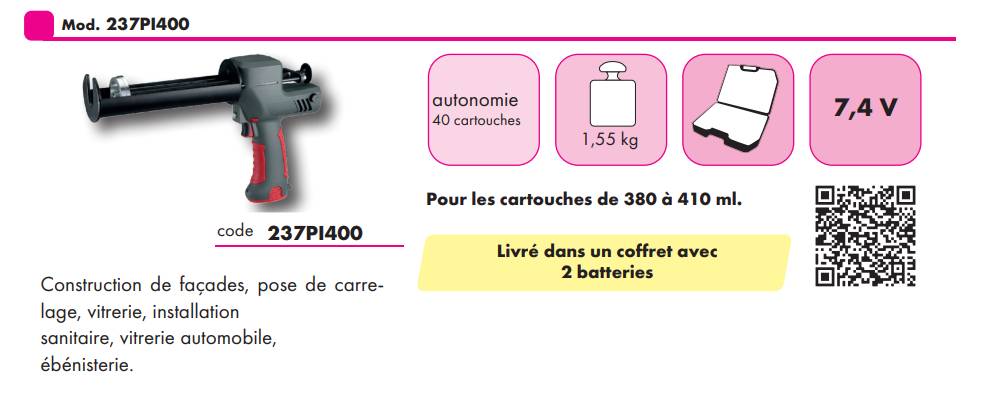 Pistolet d'injection 380 à 410 ml - 7,4 V - 237PI400