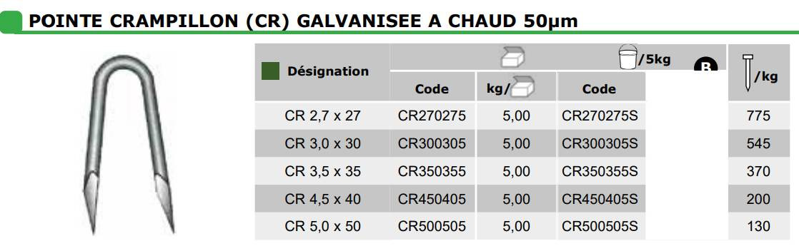 Pointes CR - Crampillon - Galvanisées à chaud - Fiche technique