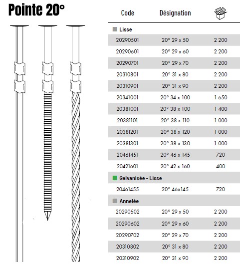 Les pointes en bande 20° sont compatibles avec les cloueurs à gaz et pneumatiques 20°. Pensées pour les chantiers exigeants, elles offrent une pose rapide, nette et résistante sur l’ensemble des applications bois : charpente, ossature, coffrage, bardage, planchers, palettes et caisses. Leur alimentation en bande sécurise l’usage et accélère le rythme de tir pour une productivité maximale.