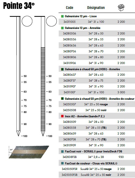 • Détails visibles sur la planche : 34° 2,8×50/55/63/70/75/80 mm ; 34° 3,1×90 mm ; 34° 3,1×100 mm ; variantes TB en 2,8×55 et 2,8×70 inox A2 ; séries couleur en 2,5×50 mm.