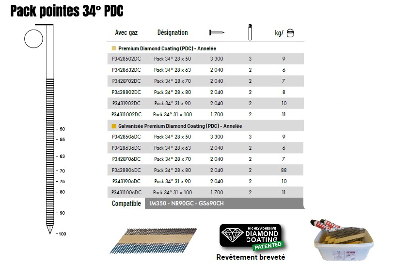 Accueil >> Pointes & Clous >> Pointes en bandes collées 34° >> POINTES EN BANDES 34° ANNELEE PREMIUM DIAMOND COATING (PDC) + GAZ
