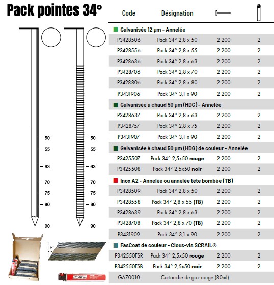 - par pack : 2 200 pointes + 2 cartouches de gaz rouge ou noir selon la référence