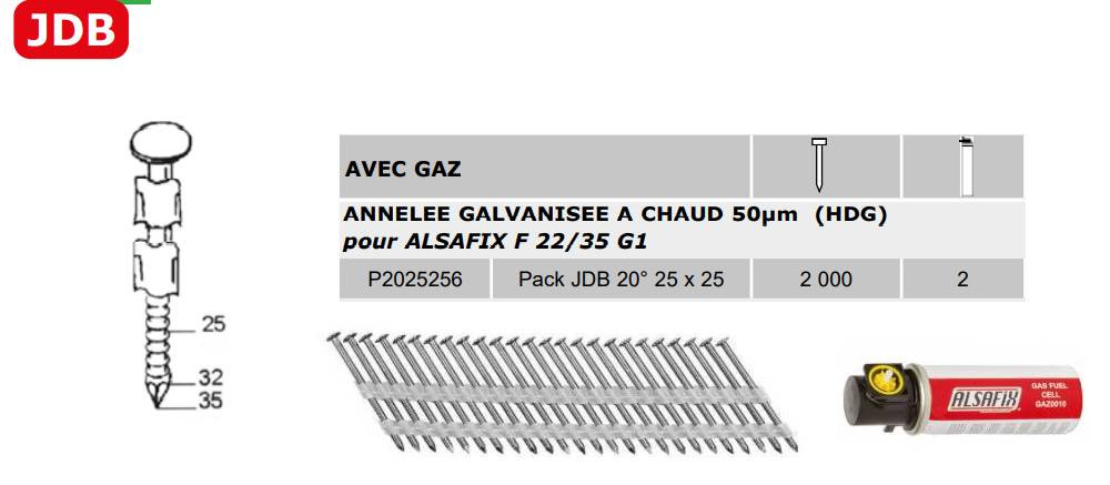 Pointes JDB annelées galvanisées à chaud 50µm (HDG) - Avec gaz