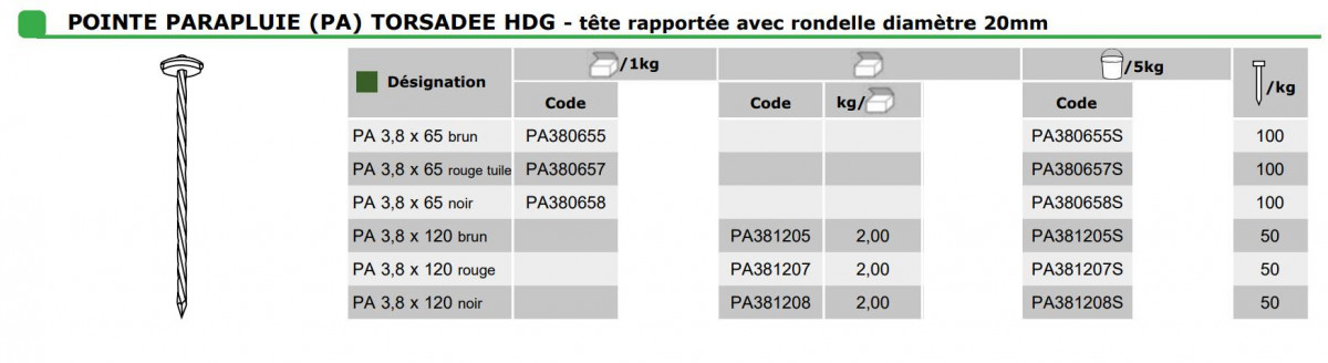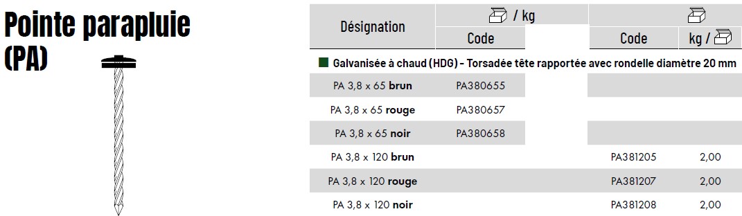 Avis sur "Pointes PA - Parapluie - Torsadées HDG - Tête rapportée avec rondelle Ø20mm"