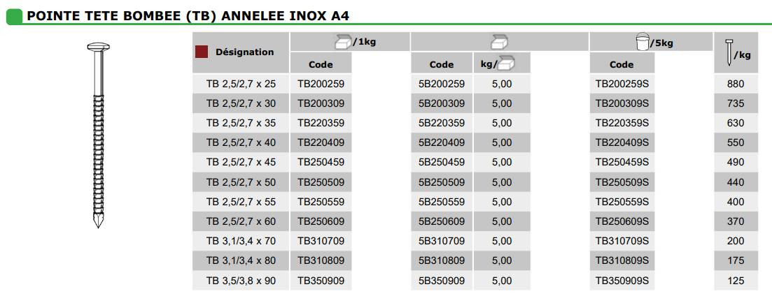 Avis sur "Pointes TB - Tête bombée - Annelées inox A4"