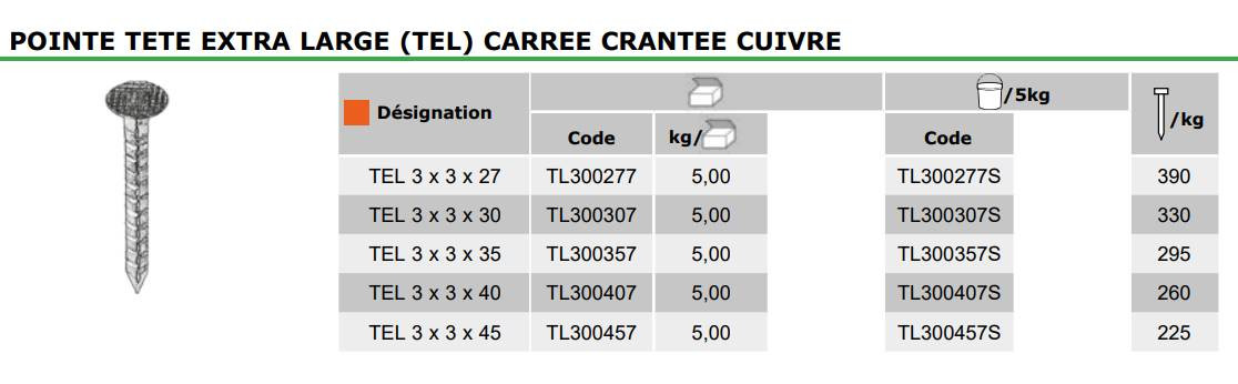 POINTE TETE EXTRA LARGE (TEL) CARREE CRANTEE CUIVRE