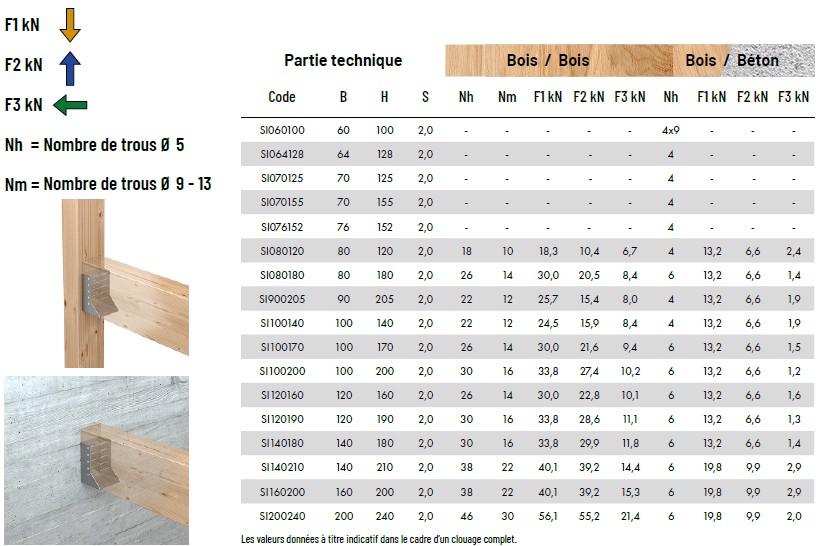 Les sabots à ailes intérieures possèdent des attaches pliées vers l’intérieur qui permettent une fixation “invisible” sur la poutre maîtresse. Ils sont principalement utilisés dans les coins.