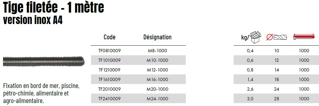 - M10 × 1000 mm (TF1010009, 0,6 kg/pièce, 10/carton)
