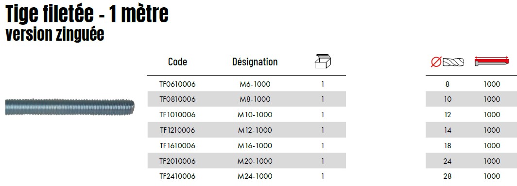 - M6 × 1000 mm (TF0610006, 1 kg/pièce)