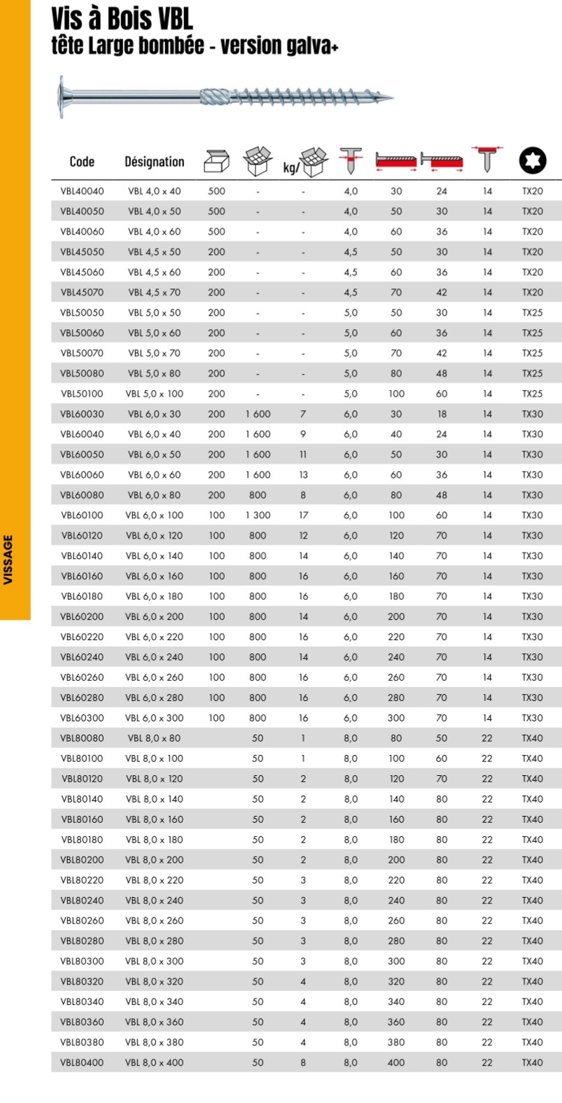 Vis à bois VBL – tête large – galva+