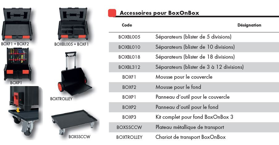 Vous pouvez ajouter plusieurs accessoires (plateau métallique de transport, séparateurs, panneau d'outil pour le couvercle etc.) en fonction de vos besoins.