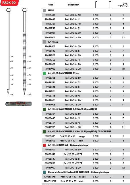 Ces bandes de pointes peuvent être achetées par carton ou en combinaison avec des cartouches de gaz pour une utilisation optimale avec des cloueurs à gaz. Elles sont disponibles dans une large gamme de matériaux - acier, galvanisé, inox - et de caractéristiques - tige lisse, annelée ou crantée, tête plate ou bombée - pour répondre à vos besoins spécifiques.